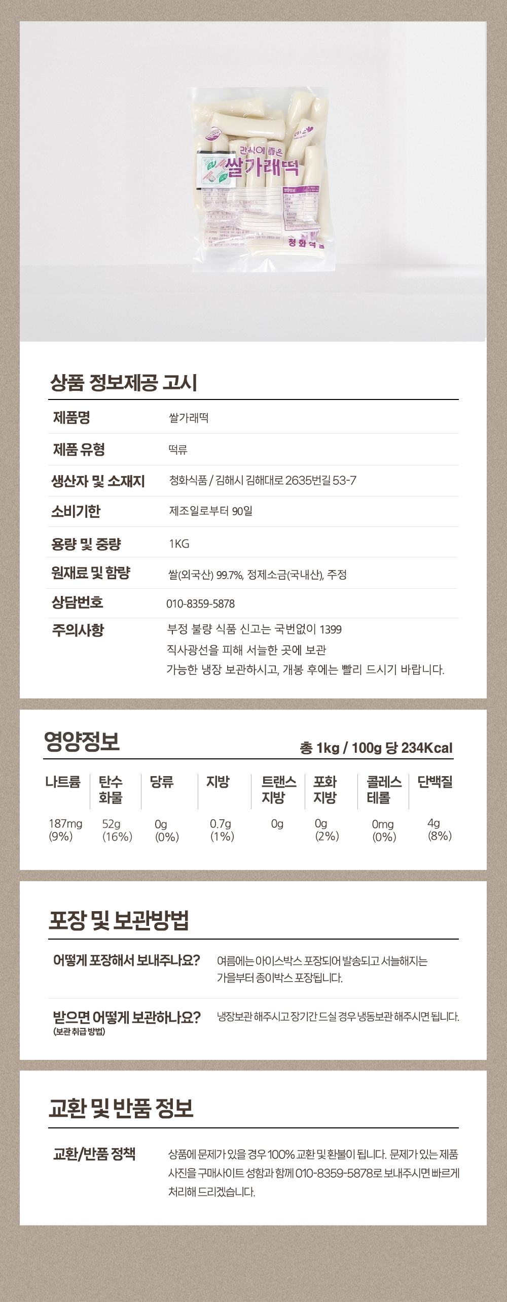 참미소 가래떡 1kg / 쌀가래떡 / 10cm * 2.5cm